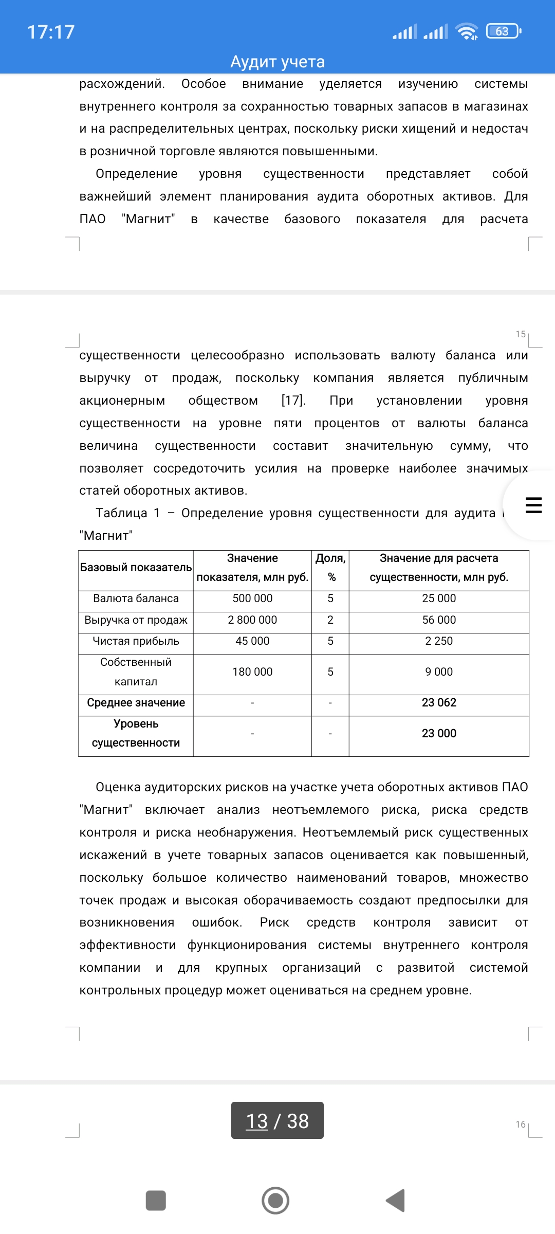Проблема достоверности учета и отражения в отчетности оборотных активов приобретает особую значимость для крупных торговых сетей, таких как ПАО "Магнит", где объемы товарных запасов, дебиторской задолженности и денежных средств исчисляются миллиардами рублей. Ошибки в учете этих элементов могут привести к неправильной оценке финансового состояния компании и принятию неэффективных управленческих решений. Качественная аудиторская проверка позволяет обеспечить достоверность финансовой информации и защитить интересы инвесторов, кредиторов и других заинтересованных сторон.