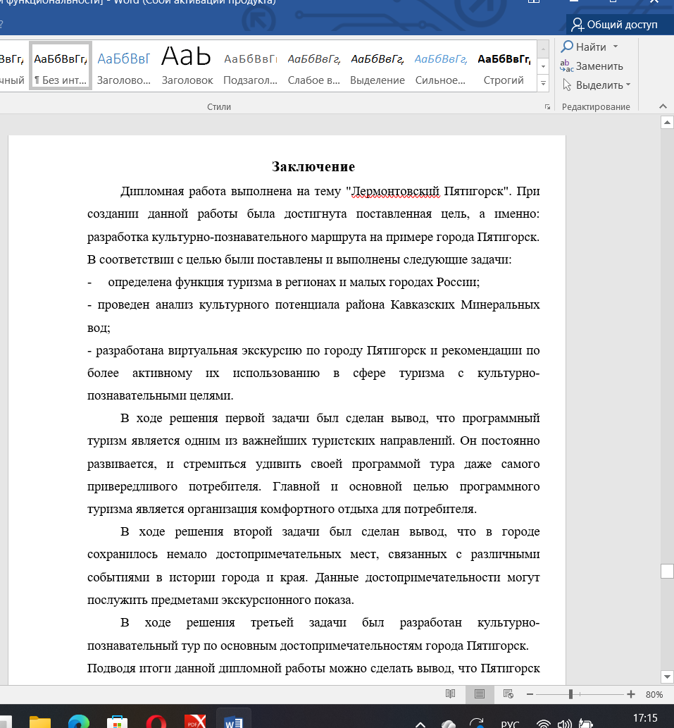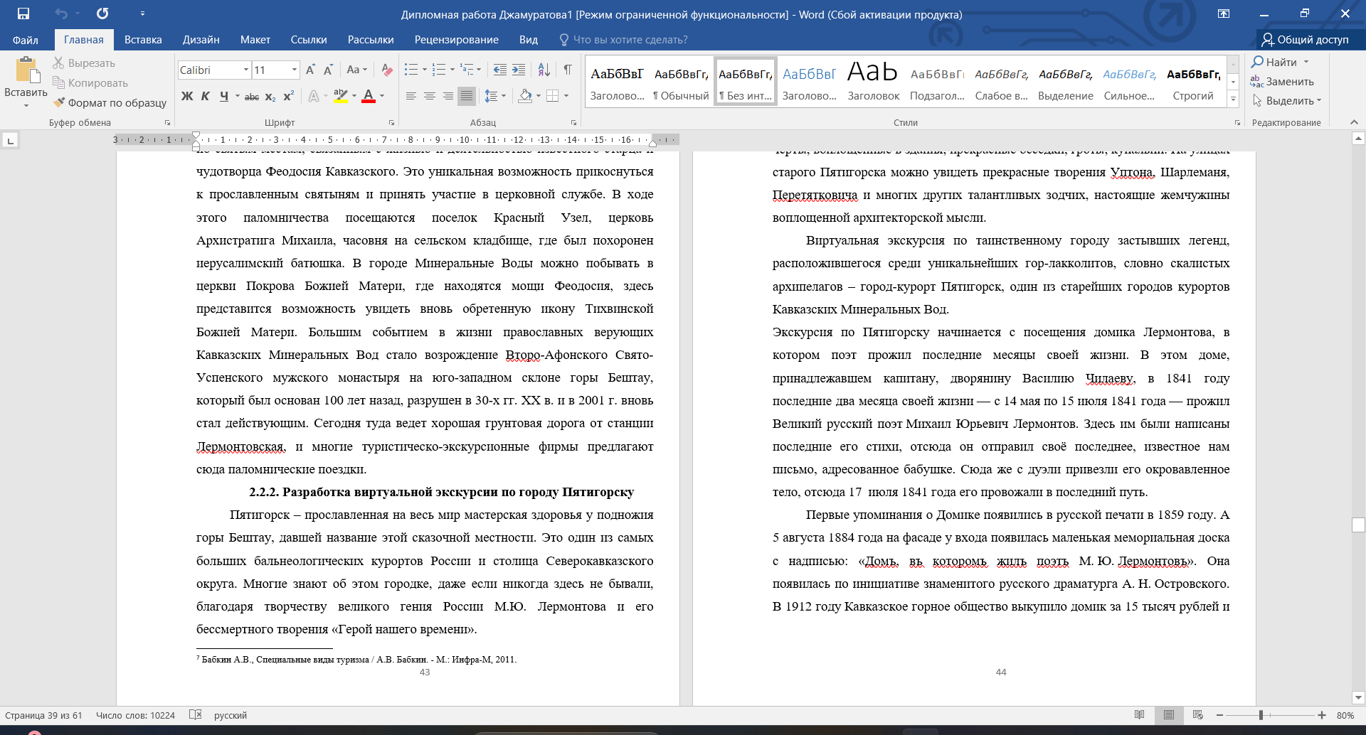 Целью дипломной работы является изучение историко-культурного потенциала района Кавказских Минеральных вод для последующей разработки виртуальной экскурсии по городу Пятигорск и рекомендаций по более активному их использованию в сфере туризма с культурно-познавательными целями.