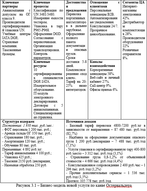 В результате разработки проекта совершенствования логистических услуг сформирована бизнес-модель новой услуги, структурированная по канве Остервальдера, где ценностное предложение определено как перевозка портативных аккумуляторов емкостью 20–100 Вт·ч в 25 стран дальнего зарубежья с оформлением полного пакета документации опасного груза, целевые сегменты представлены интернет-магазинами электроники, формирующими 42% выручки, дистрибьюторами комплектующих с долей 28% и производителями оборудования с долей 22%, а ценовое позиционирование обеспечивает тариф 5 400 руб./кг, что на 20–25% ниже интеграторов DHL и FedEx при сроках доставки 5–8 дней. Капитальные вложения в размере 11,3 млн рублей распределены между разработкой IT-модуля электронного декларирования, составляющей 37,2% инвестиций, модернизацией складского помещения на сумму 32,6% и закупкой измерительного оборудования, формирующего 25,1% затрат. Прогноз первого операционного года 2026 предусматривает выручку 105,8 млн рублей при маржинальности 25,1% и рентабельности по чистой прибыли 1,4% с ростом показателя до 15,8% к 2030 году по мере масштабирования операций и распределения постоянных издержек на возрастающую базу.