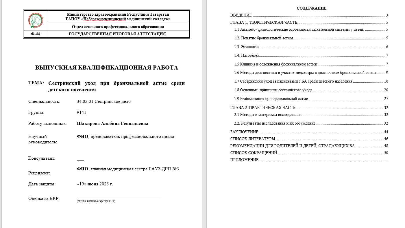 Практическое значение выпускной квалификационной работы: подробное изучение материала по данной теме позволит повысить качество оказываемого ухода за пациентами детского возраста имеющие диагноз бронхиальная астма.