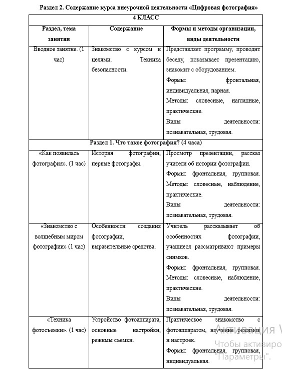 Цель исследования – изучение содержания деятельности учителя по обучению младших школьников цифровой фотографии во внеурочной деятельности в начальной общеобразовательной школе (на примере программы внеурочной деятельности «Цифровая фотография» для обучающихся 4 классов).