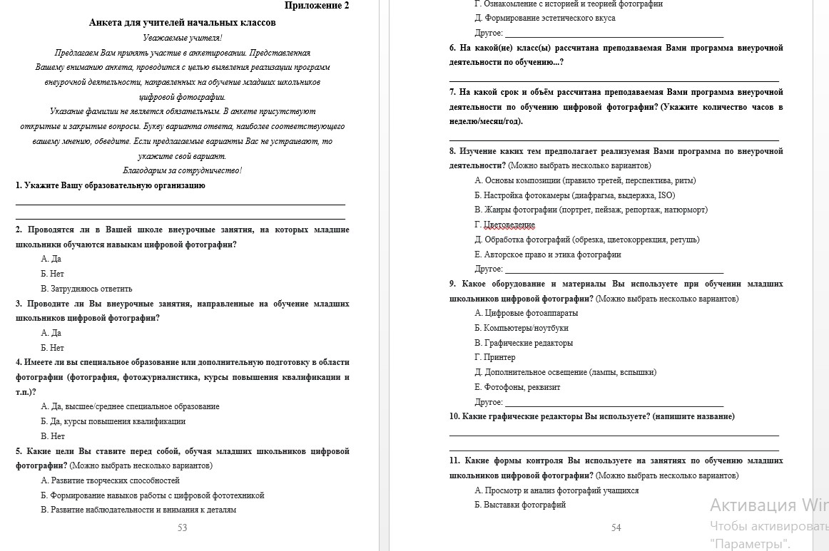 Приложение 2. Анкета для учителей начальных классов……………...………………………………………………………….…53