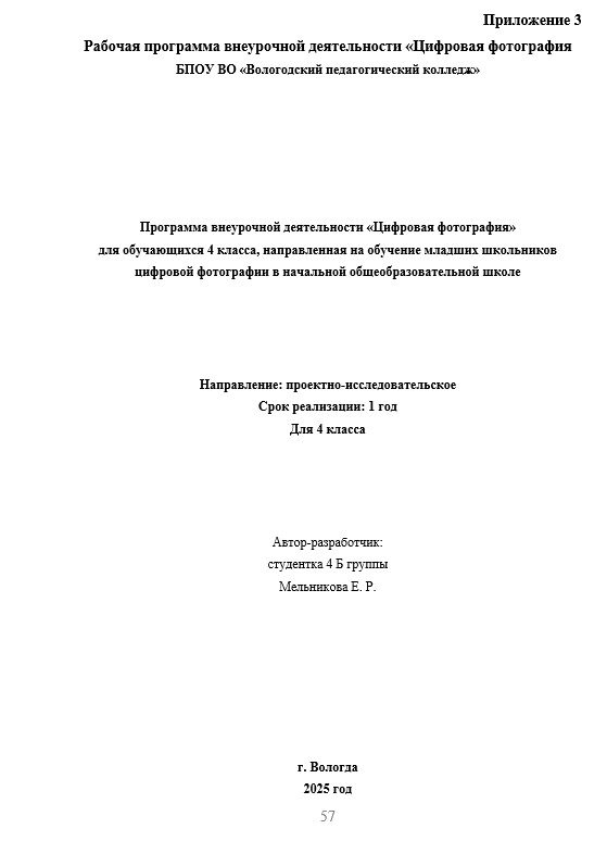Приложение 3. Рабочая программа внеурочной деятельности «Цифровая фотография……………………………………………………………………….57