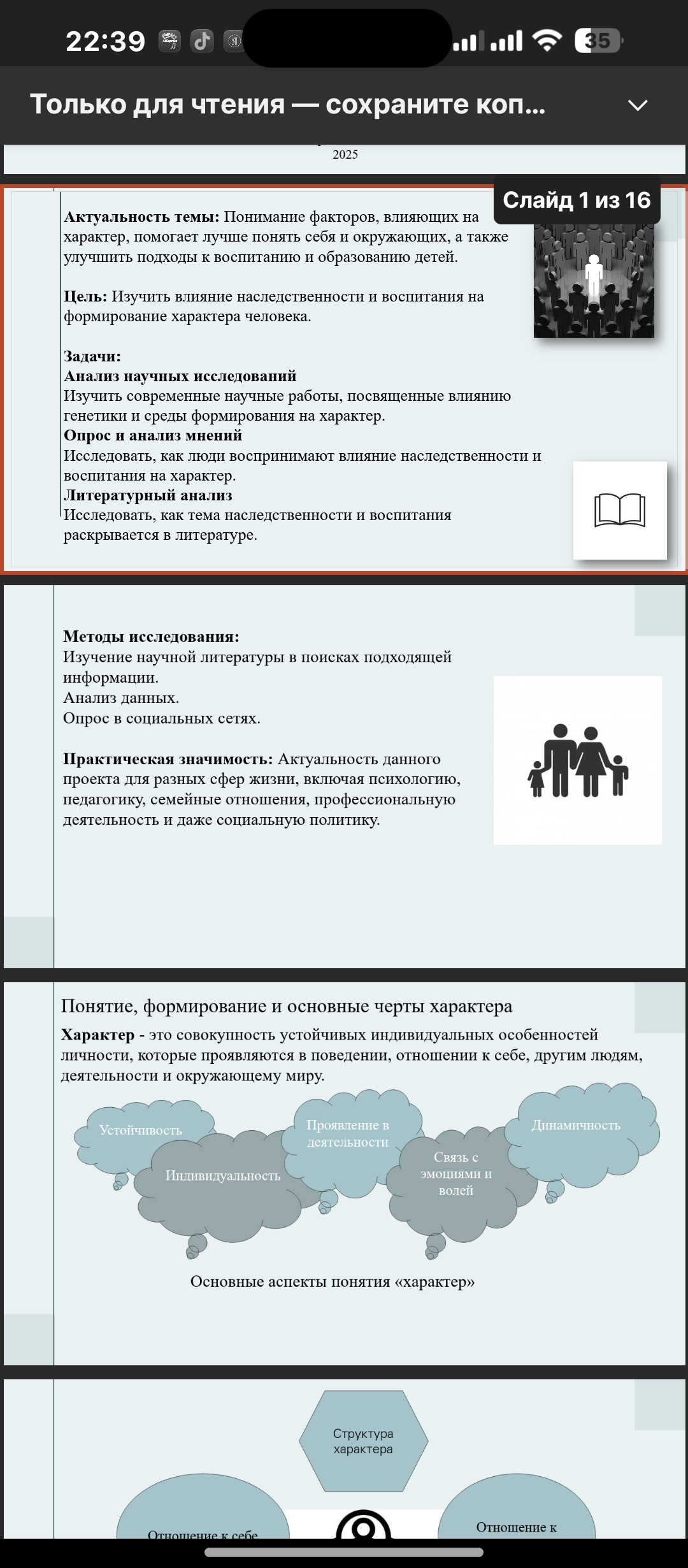 Актуальность темы: Понимание факторов, влияющих на характер, помогает лучше понять себя и окружающих, а также улучшить подходы к воспитанию и образованию.
