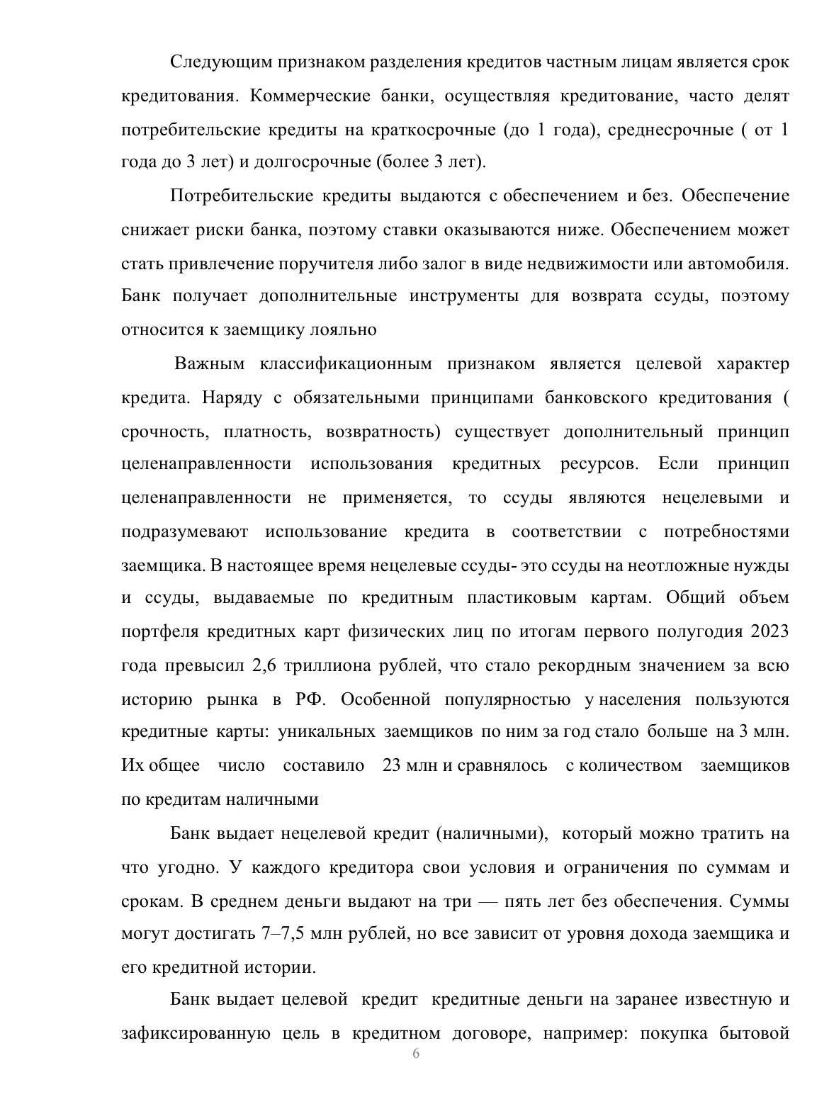 Важным классификационным признаком является целевой характер кредита. Наряду с обязательными принципами банковского кредитования ( срочность, платность, возвратность) существует дополнительный принцип целенаправленности использования кредитных ресурсов. Если принцип целенаправленности не применяется, то ссуды являются нецелевыми и подразумевают использование кредита в соответствии с потребностями заемщика. В настоящее время нецелевые ссуды- это ссуды на неотложные нужды и ссуды, выдаваемые по кредитным пластиковым картам. Общий объем портфеля кредитных карт физических лиц по итогам первого полугодия 2023 года превысил 2,6 триллиона рублей, что стало рекордным значением за всю историю рынка в РФ. Особенной популярностью у населения пользуются кредитные карты: уникальных заемщиков по ним за год стало больше на 3 млн. Их общее число составило 23 млн и сравнялось с количеством заемщиков по кредитам наличными