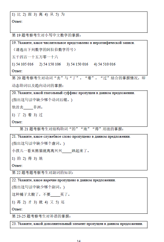 因为俄罗斯汉语高考于 2019 年才首次正式进行,关于俄罗斯的汉语高考的研究和分析文献比较少。 在俄罗斯唯一的对该考试比较多面的分析是韦尔比茨卡娅 M.V.和马斯洛韦茨 O.A.(2019)的《基于 2019 年汉语考试应试者偏误分析的向教员制定的方法建议》10。作者介绍了试卷的组成,并分析了应试者在考试