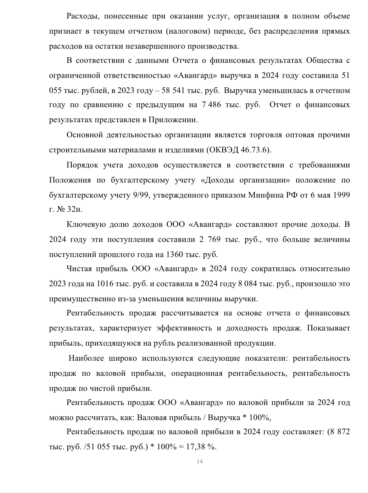 В соответствии с данными Отчета о финансовых результатах Общества с ограниченной ответственностью «Авангард» выручка в 2024 году составила 51 055 тыс. рублей, в 2023 году – 58 541 тыс. руб. Выручка уменьшилась в отчетном году по сравнению с предыдущим на 7 486 тыс. руб. Отчет о финансовых результатах представлен в Приложении.